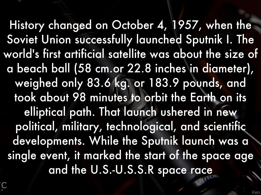 History changed on October 4, 1957, when the Soviet Union successfully launched Sputnik I. The world's first artificial satellite was about the size of a beach ball (58 cm.or 22.8 inches in diameter), weighed only 83.6 kg. or 183.9 pounds, and took about 98 minutes to orbit the Earth on its elliptical path. That launch ushered in new political, military, technological, and scientific developments. While the Sputnik launch was a single event, it marked the start of the space age and the U.S.-U.S.S.R space race