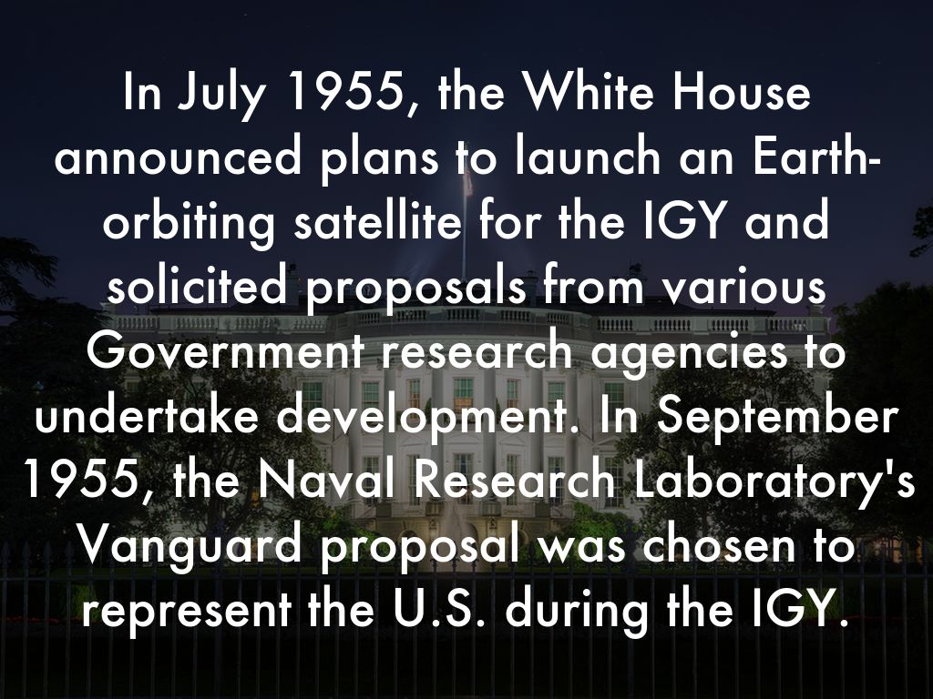 In July 1955, the White House announced plans to launch an Earth-orbiting satellite for the IGY and solicited proposals from various Government research agencies to undertake development. In September 1955, the Naval Research Laboratory's Vanguard proposal was chosen to represent the U.S. during the IGY.