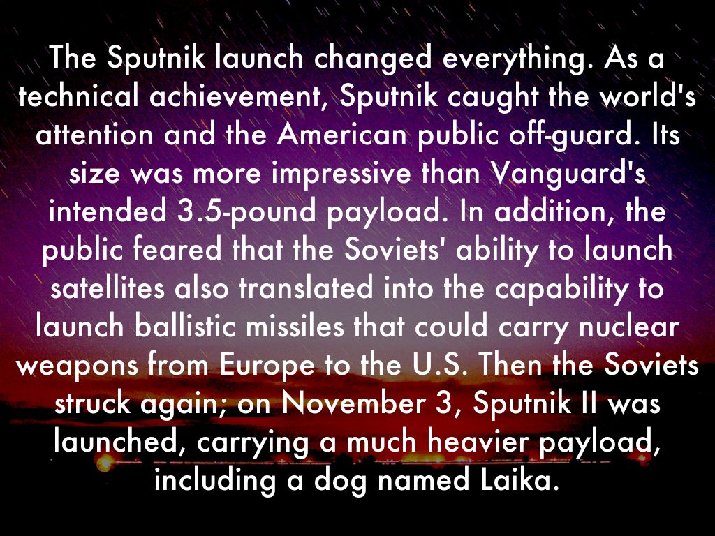 The Sputnik launch changed everything. As a technical achievement, Sputnik caught the world's attention and the American public off-guard. Its size was more impressive than Vanguard's intended 3.5-pound payload. In addition, the public feared that the Soviets' ability to launch satellites also translated into the capability to launch ballistic missiles that could carry nuclear weapons from Europe to the U.S. Then the Soviets struck again; on November 3, Sputnik II was launched, carrying a much heavier payload, including a dog named Laika.