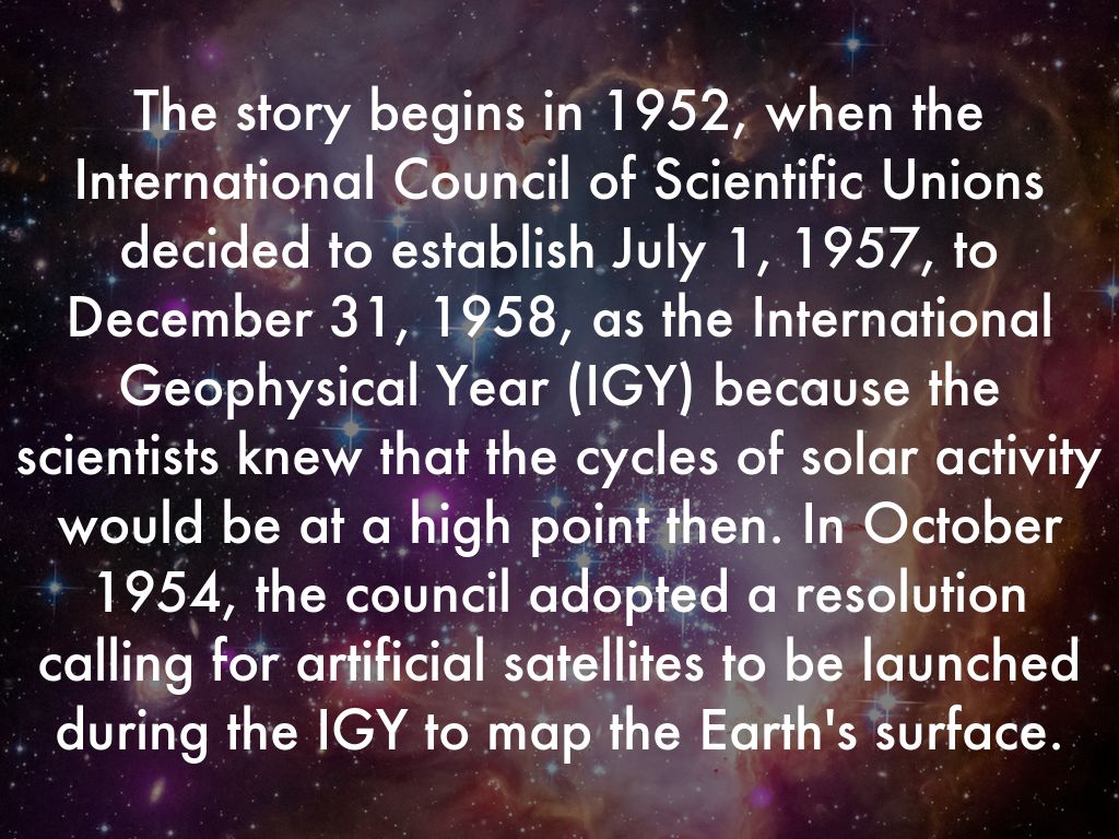 The story begins in 1952, when the International Council of Scientific Unions decided to establish July 1, 1957, to December 31, 1958, as the International Geophysical Year (IGY) because the scientists knew that the cycles of solar activity would be at a high point then. In October 1954, the council adopted a resolution calling for artificial satellites to be launched during the IGY to map the Earth's surface.