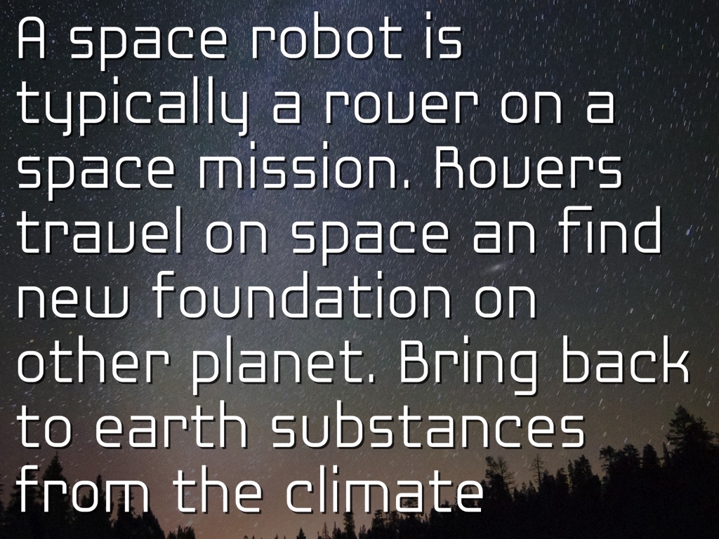 A space robot is typically a rover on a space mission. Rovers travel on space an find new foundation on other planet. Bring back to earth substances from the climate