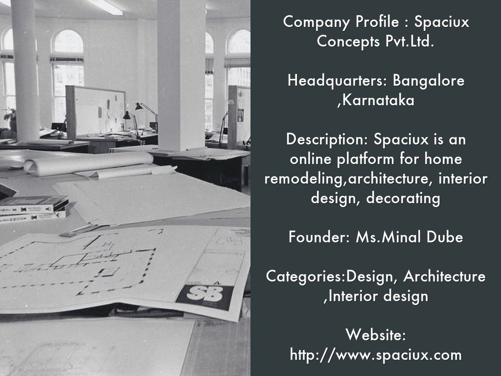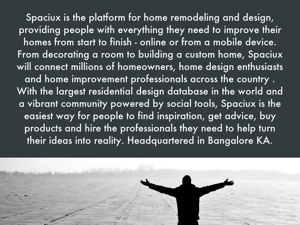 Spaciux is the platform for home remodeling and design, providing people with everything they need to improve their homes from start to finish - online or from a mobile device. From decorating a room to building a custom home, Spaciux will connect millions of homeowners, home design enthusiasts and home improvement professionals across the country . With the largest residential design database in the world and a vibrant community powered by social tools, Spaciux is the easiest way for people to find inspiration, get advice, buy products and hire the professionals they need to help turn their ideas into reality. Headquartered in Bangalore KA.