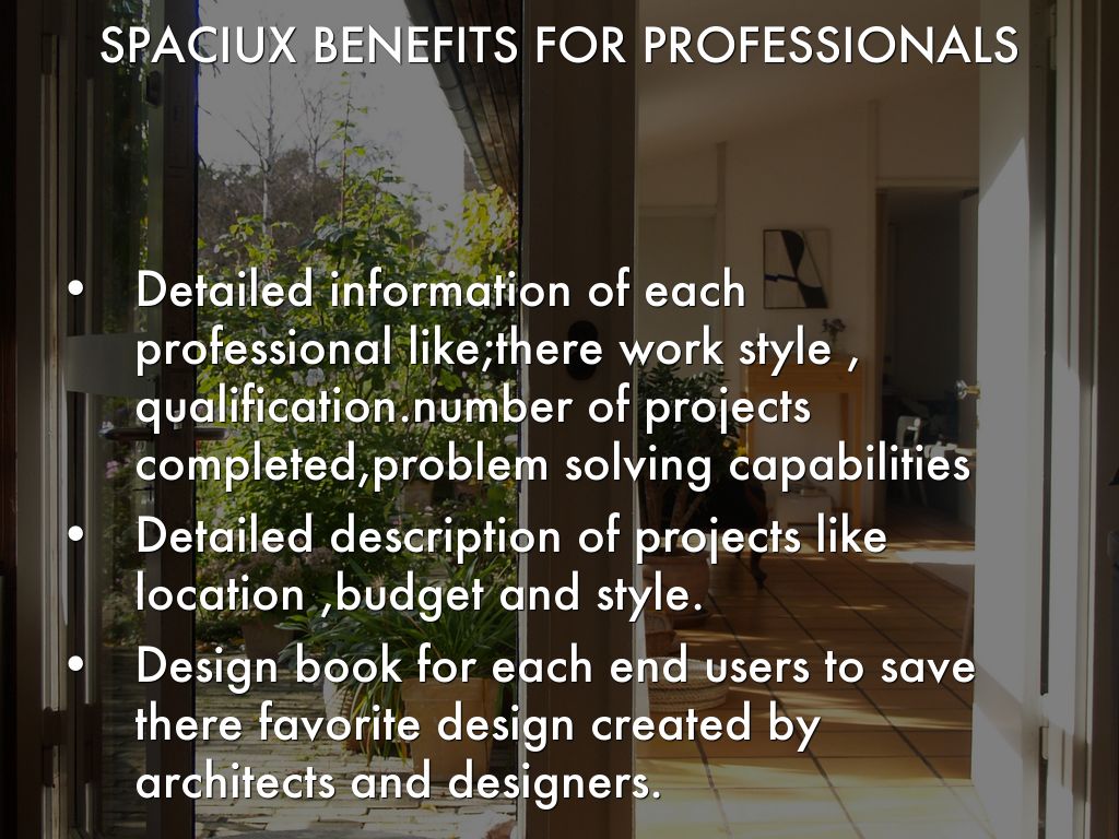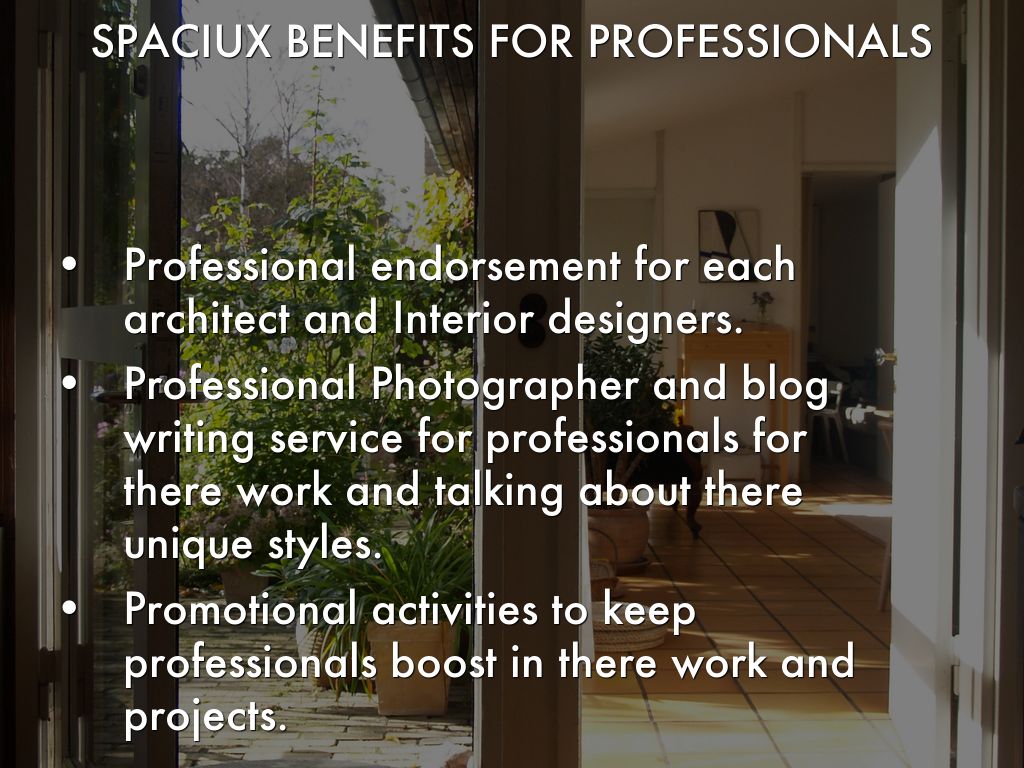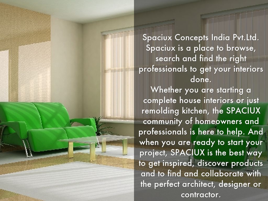 Spaciux Concepts India Pvt.Ltd. Spaciux is a place to browse, search and find the right professionals to get your interiors done. Whether you are starting a complete house interiors or just remolding kitchen, the SPACIUX community of homeowners and professionals is here to help. And when you are ready to start your project, SPACIUX is the best way to get inspired, discover products and to find and collaborate with the perfect architect, designer or contractor.