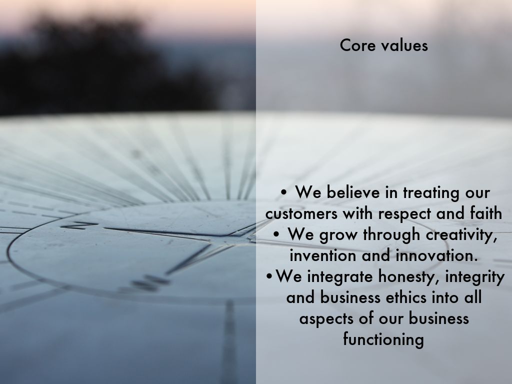 • We believe in treating our customers with respect and faith • We grow through creativity, invention and innovation. •We integrate honesty, integrity and business ethics into all aspects of our business functioning