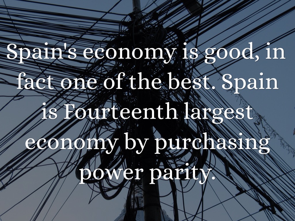 Spain's economy is good, in fact one of the best. Spain is Fourteenth largest economy by purchasing power parity.