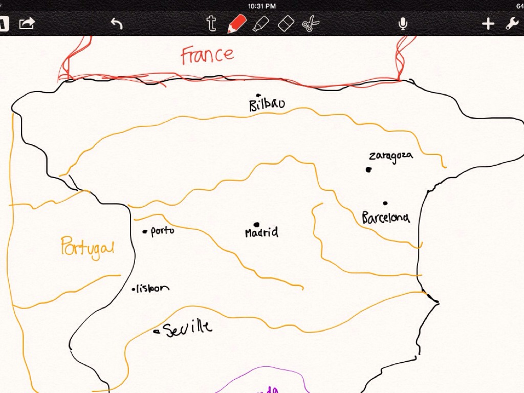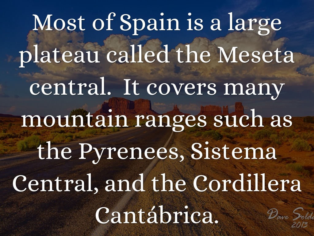 Most of Spain is a large plateau called the Meseta central. It covers many mountain ranges such as the Pyrenees, Sistema Central, and the Cordillera Cantábrica.