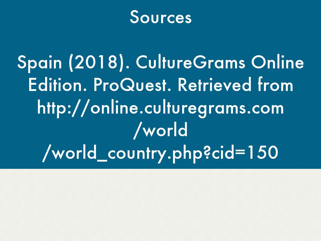 Spain (2018). CultureGrams Online Edition. ProQuest. Retrieved from