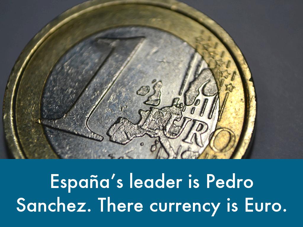 España’s leader is Pedro Sanchez. There currency is Euro.