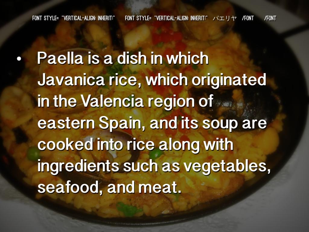 Paella is a dish in which Javanica rice, which originated in the Valencia region of eastern Spain, and its soup are cooked into rice along with ingredients such as vegetables, seafood, and meat.