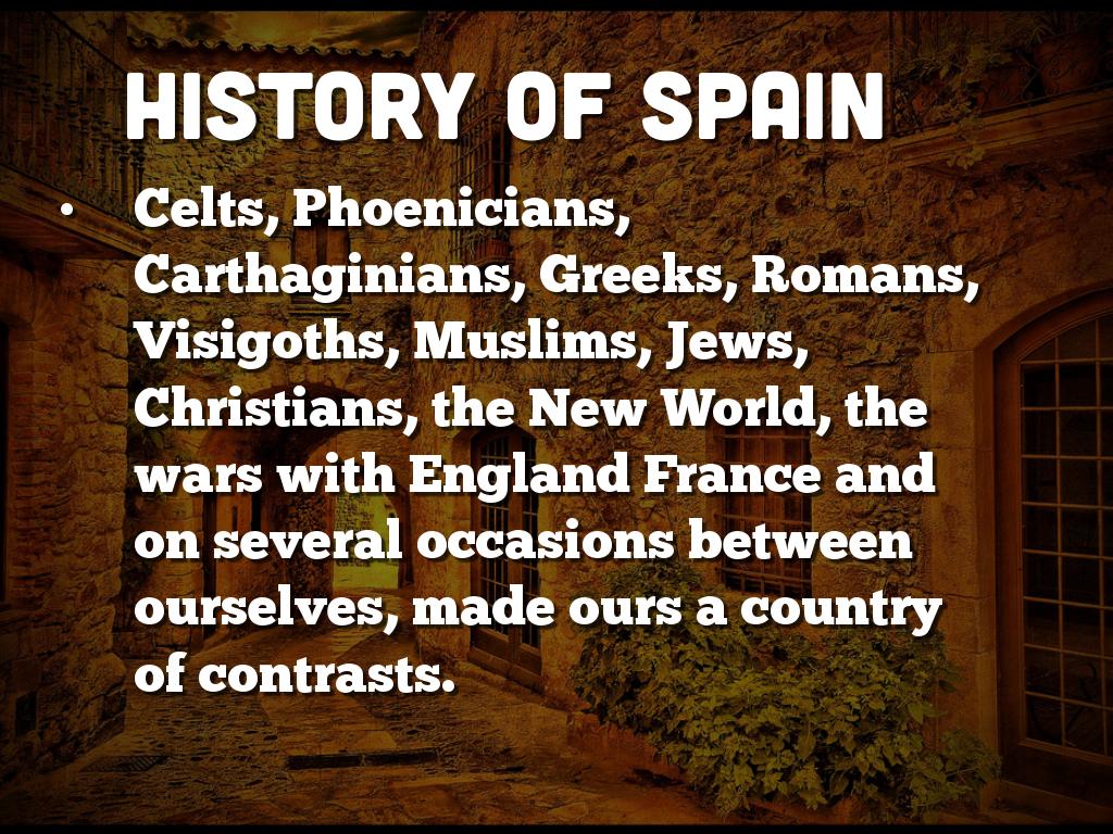 Celts, Phoenicians, Carthaginians, Greeks, Romans, Visigoths, Muslims, Jews, Christians, the New World, the wars with England France and on several occasions between ourselves, made ours a country of contrasts.