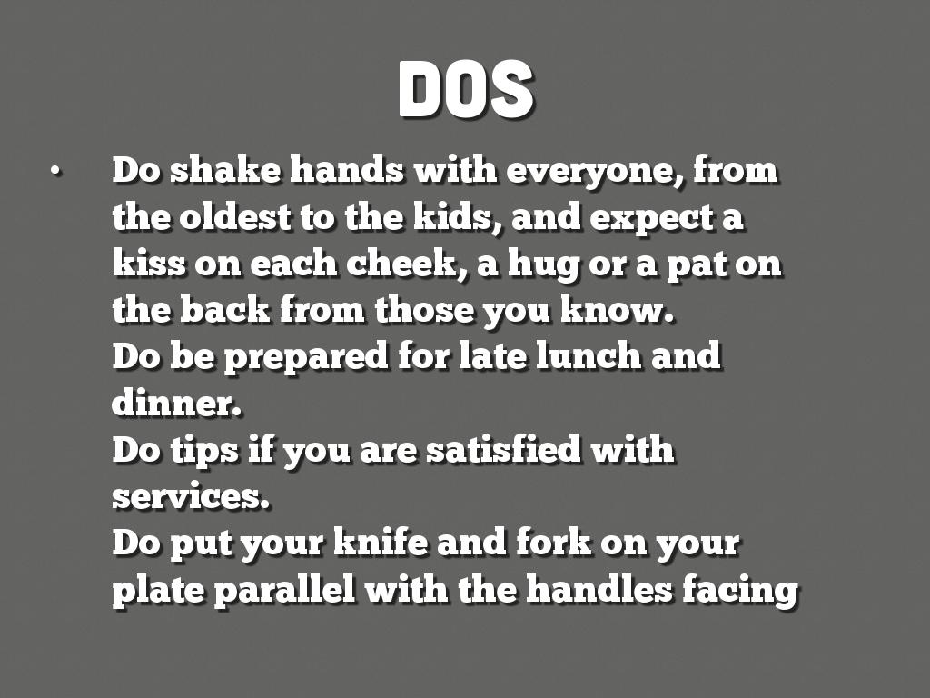 Do shake hands with everyone, from the oldest to the kids, and expect a kiss on each cheek, a hug or a pat on the back from those you know.