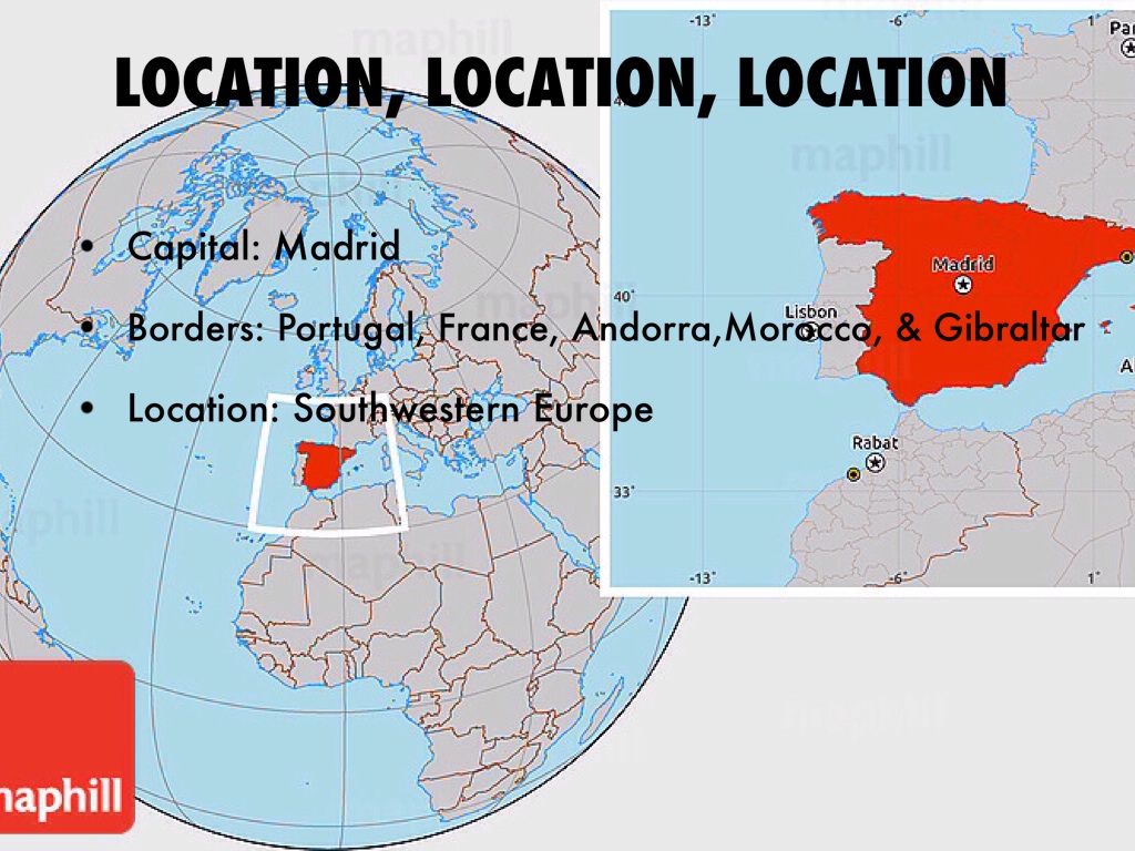 Borders: Portugal, France, Andorra,Morocco, & Gibraltar