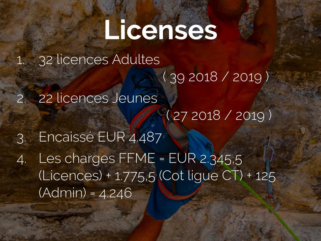 • Les charges FFME = EUR 2.345,5 (Licences) + 1.775,5 (Cot ligue CT) + 125 (Admin) = 4.246