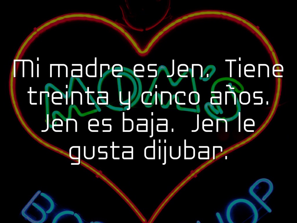 Mi madre es Jen. Tiene treinta y cinco años. Jen es baja. Jen le gusta dijubar.