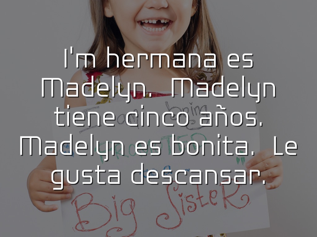 I'm hermana es Madelyn. Madelyn tiene cinco años. Madelyn es bonita. Le gusta descansar.