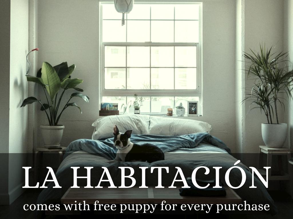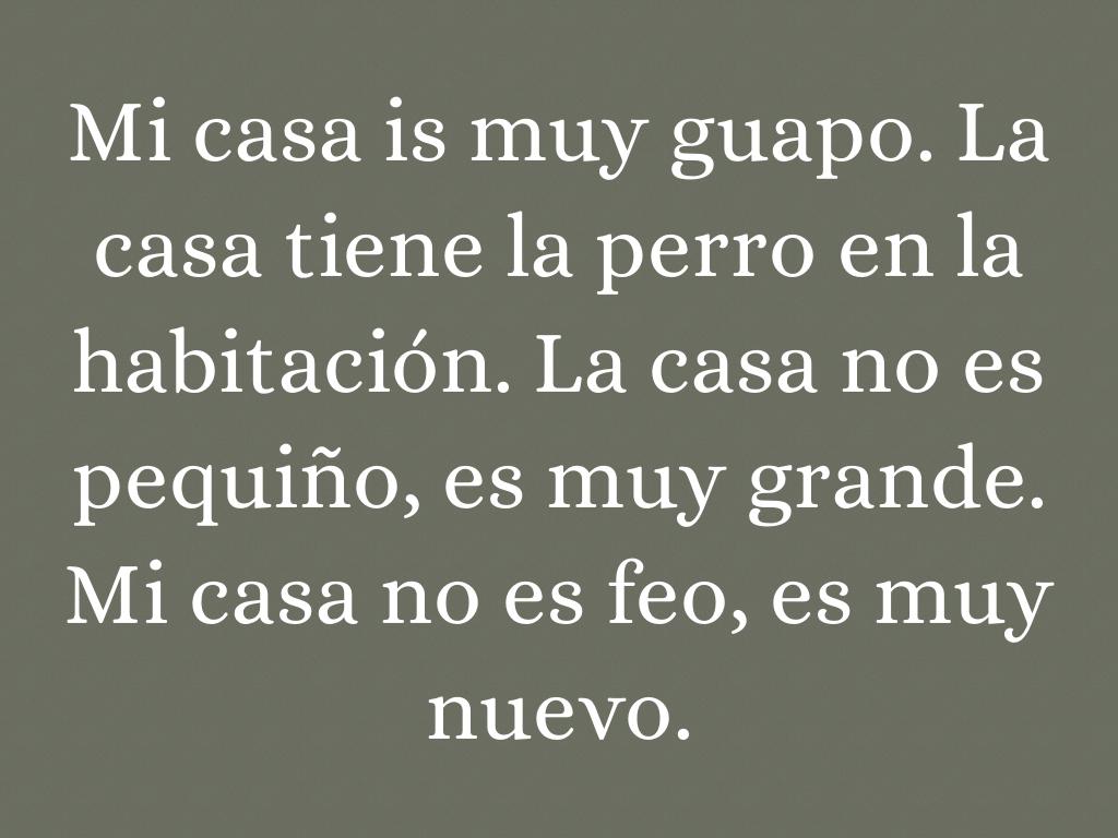 Mi casa is muy guapo. La casa tiene la perro en la habitación. La casa no es pequiño, es muy grande. Mi casa no es feo, es muy nuevo.