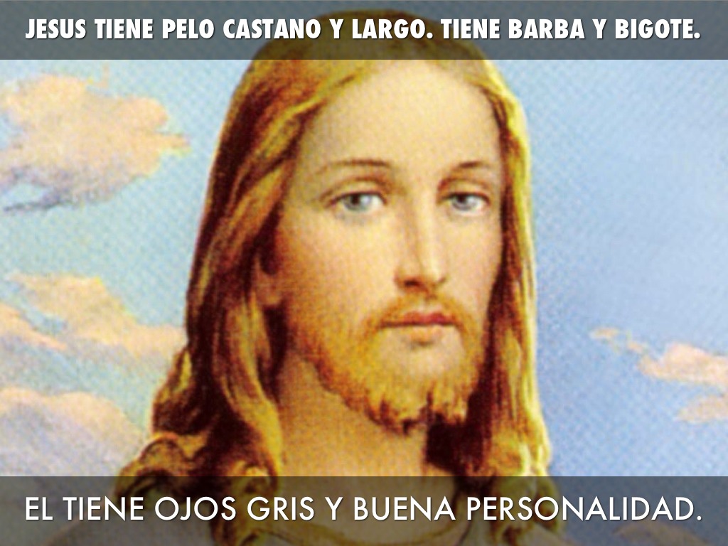 JESUS TIENE PELO CASTANO Y LARGO. TIENE BARBA Y BIGOTE.