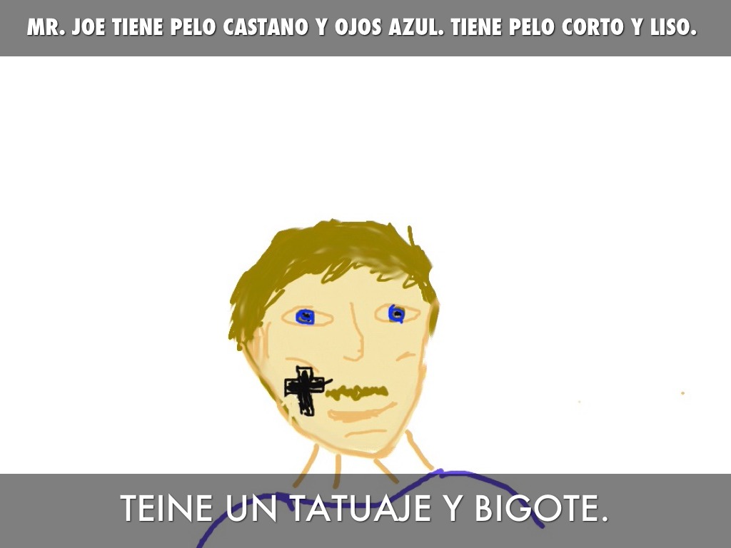 MR. JOE TIENE PELO CASTANO Y OJOS AZUL. TIENE PELO CORTO Y LISO.
