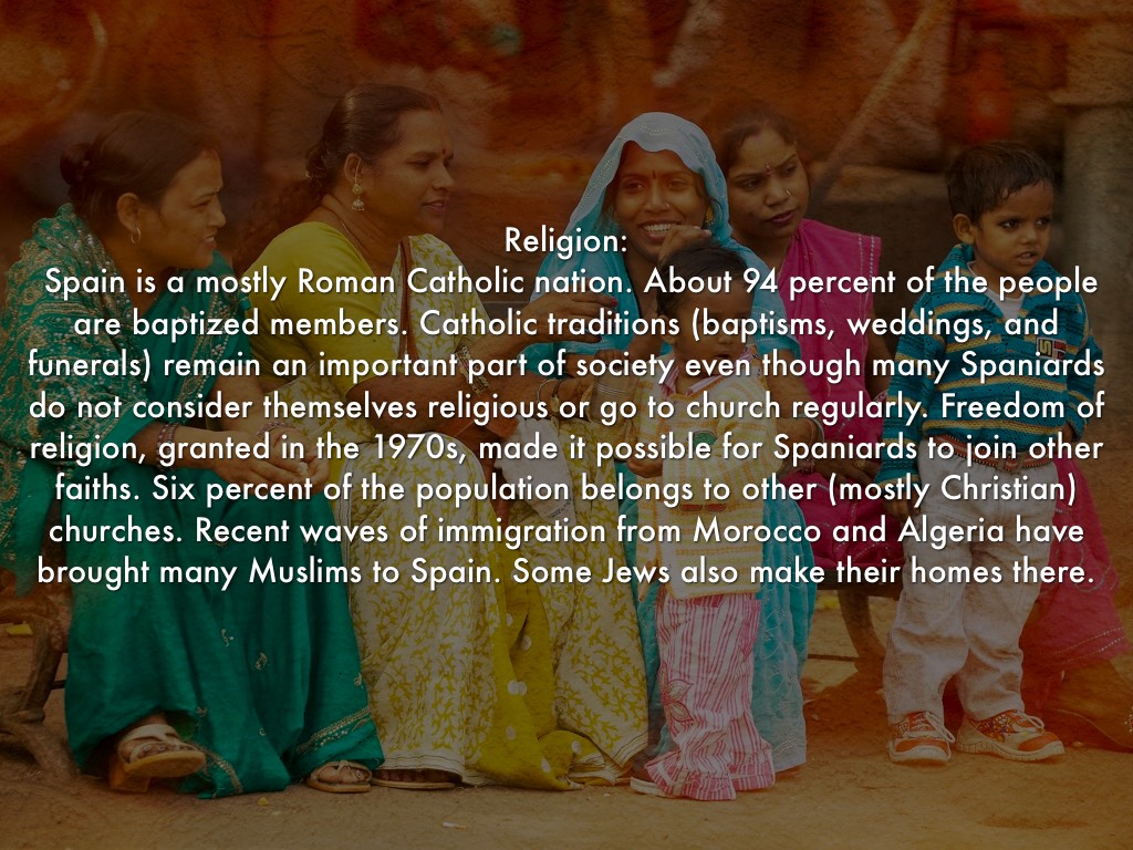 Religion: Spain is a mostly Roman Catholic nation. About 94 percent of the people are baptized members. Catholic traditions (baptisms, weddings, and funerals) remain an important part of society even though many Spaniards do not consider themselves religious or go to church regularly. Freedom of religion, granted in the 1970s, made it possible for Spaniards to join other faiths. Six percent of the population belongs to other (mostly Christian) churches. Recent waves of immigration from Morocco and Algeria have brought many Muslims to Spain. Some Jews also make their homes there.