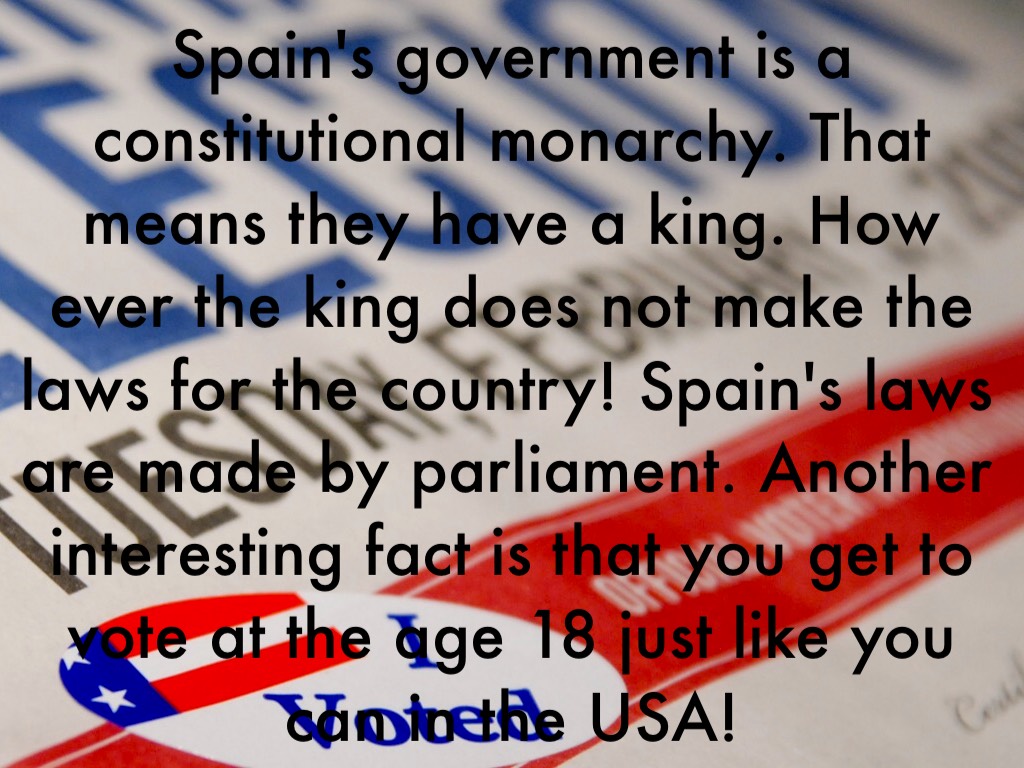 Spain's government is a constitutional monarchy. That means they have a king. How ever the king does not make the laws for the country! Spain's laws are made by parliament. Another interesting fact is that you get to vote at the age 18 just like you can in the USA!