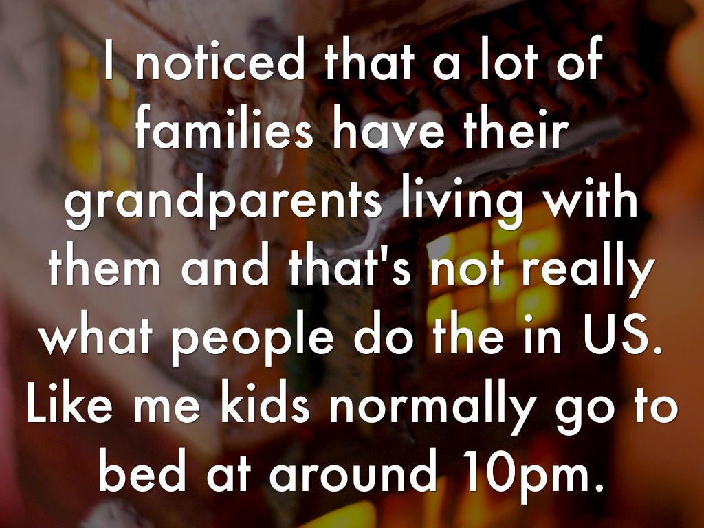 I noticed that a lot of families have their grandparents living with them and that's not really what people do the in US. Like me kids normally go to bed at around 10pm.