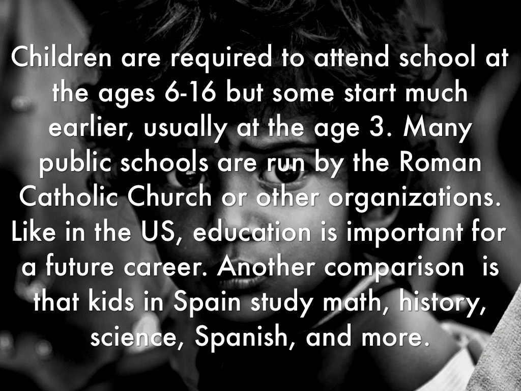 Children are required to attend school at the ages 6-16 but some start much earlier, usually at the age 3. Many public schools are run by the Roman Catholic Church or other organizations. Like in the US, education is important for a future career. Another comparison is that kids in Spain study math, history, science, Spanish, and more.