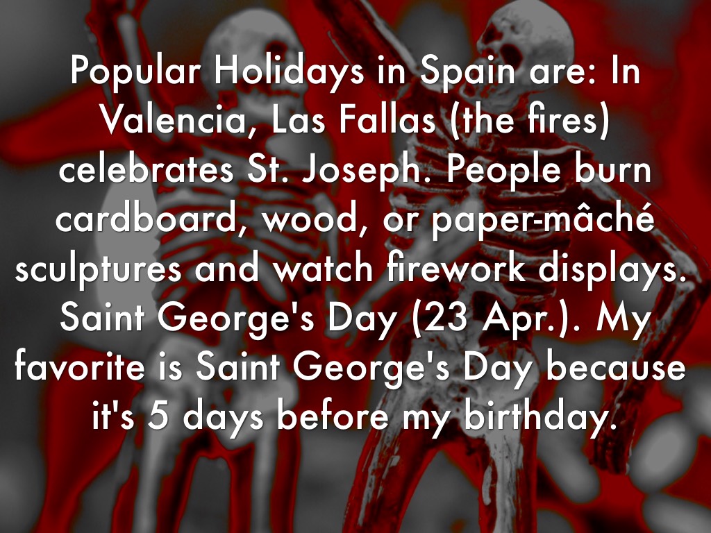 Popular Holidays in Spain are: In Valencia, Las Fallas (the fires) celebrates St. Joseph. People burn cardboard, wood, or paper-mâché sculptures and watch firework displays. Saint George's Day (23 Apr.). My favorite is Saint George's Day because it's 5 days before my birthday.