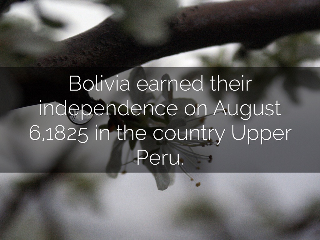 Bolivia earned their independence on August 6,1825 in the country Upper Peru.