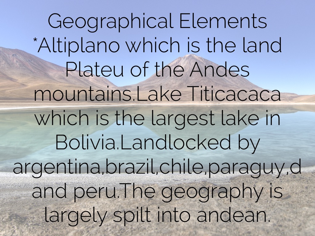 *Altiplano which is the land Plateu of the Andes mountains.Lake Titicacaca which is the largest lake in Bolivia.Landlocked by argentina,brazil,chile,paraguy,d and peru.The geography is largely spilt into andean.