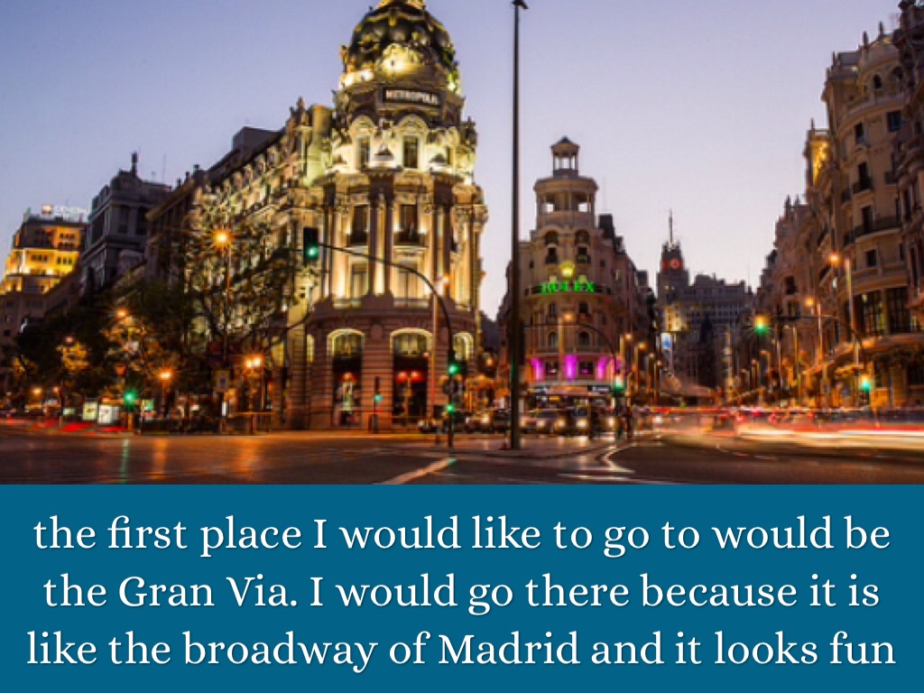 the first place I would like to go to would be the Gran Via. I would go there because it is like the broadway of Madrid and it looks fun
