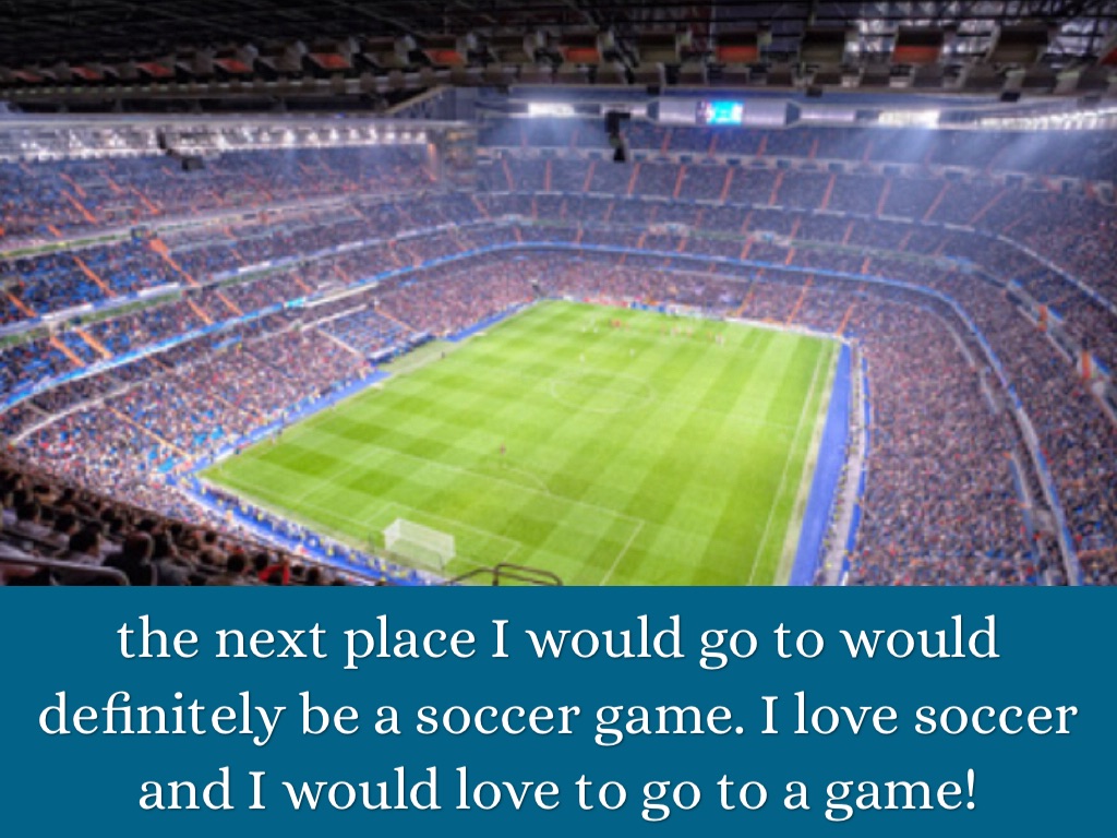 the next place I would go to would definitely be a soccer game. I love soccer and I would love to go to a game!