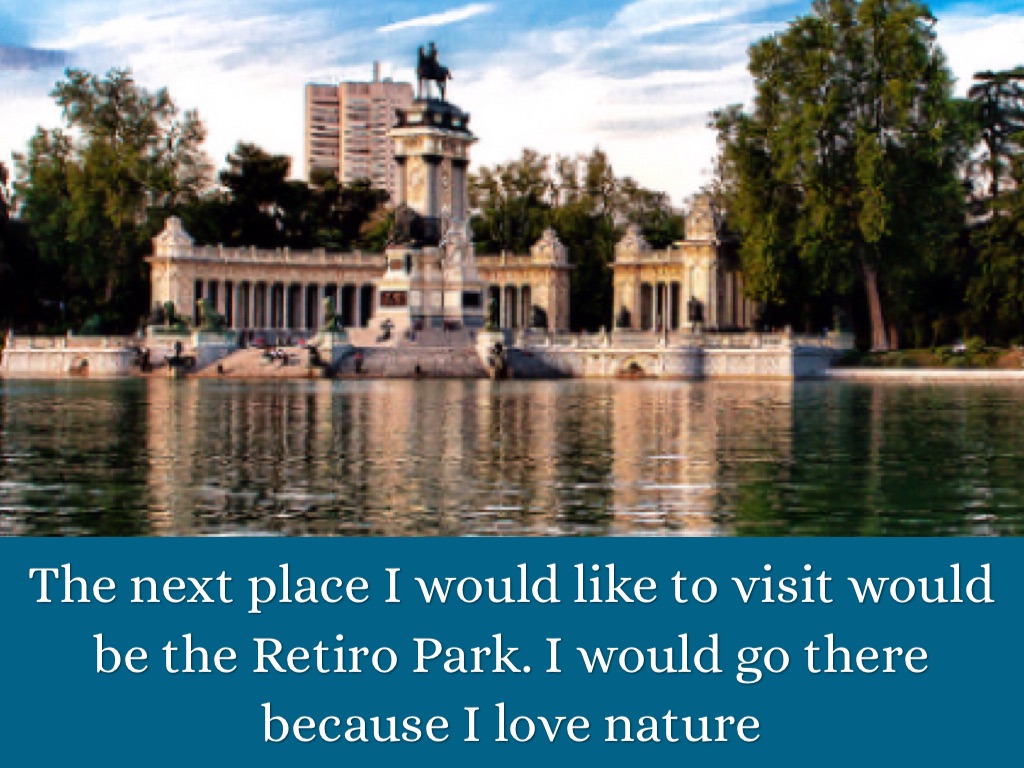 The next place I would like to visit would be the Retiro Park. I would go there because I love nature