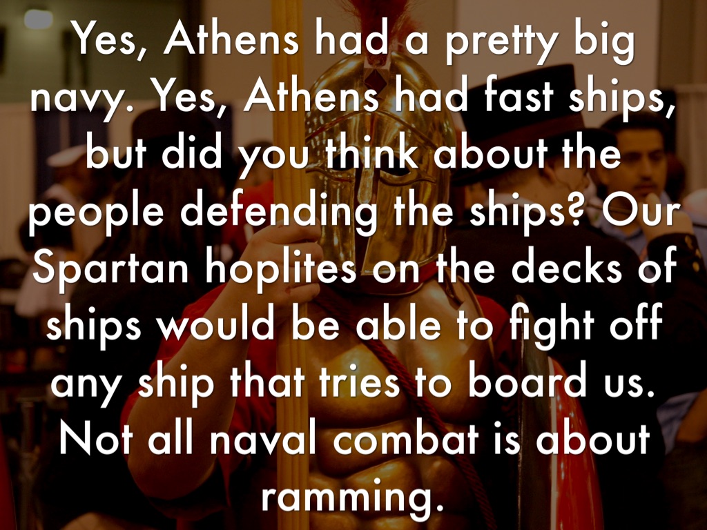 Yes, Athens had a pretty big navy. Yes, Athens had fast ships, but did you think about the people defending the ships? Our Spartan hoplites on the decks of ships would be able to fight off any ship that tries to board us. Not all naval combat is about ramming.