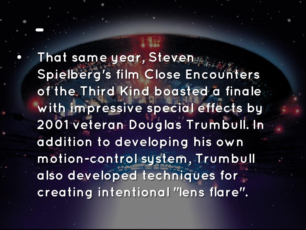 That same year, Steven Spielberg's film Close Encounters of the Third Kind boasted a finale with impressive special effects by 2001 veteran Douglas Trumbull. In addition to developing his own motion-control system, Trumbull also developed techniques for creating intentional "lens flare".