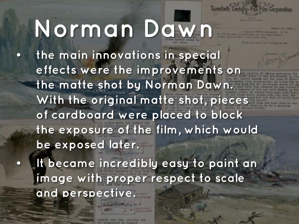 the main innovations in special effects were the improvements on the matte shot by Norman Dawn. With the original matte shot, pieces of cardboard were placed to block the exposure of the film, which would be exposed later.