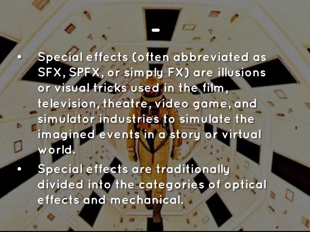 Special effects (often abbreviated as SFX, SPFX, or simply FX) are illusions or visual tricks used in the film, television, theatre, video game, and simulator industries to simulate the imagined events in a story or virtual world.