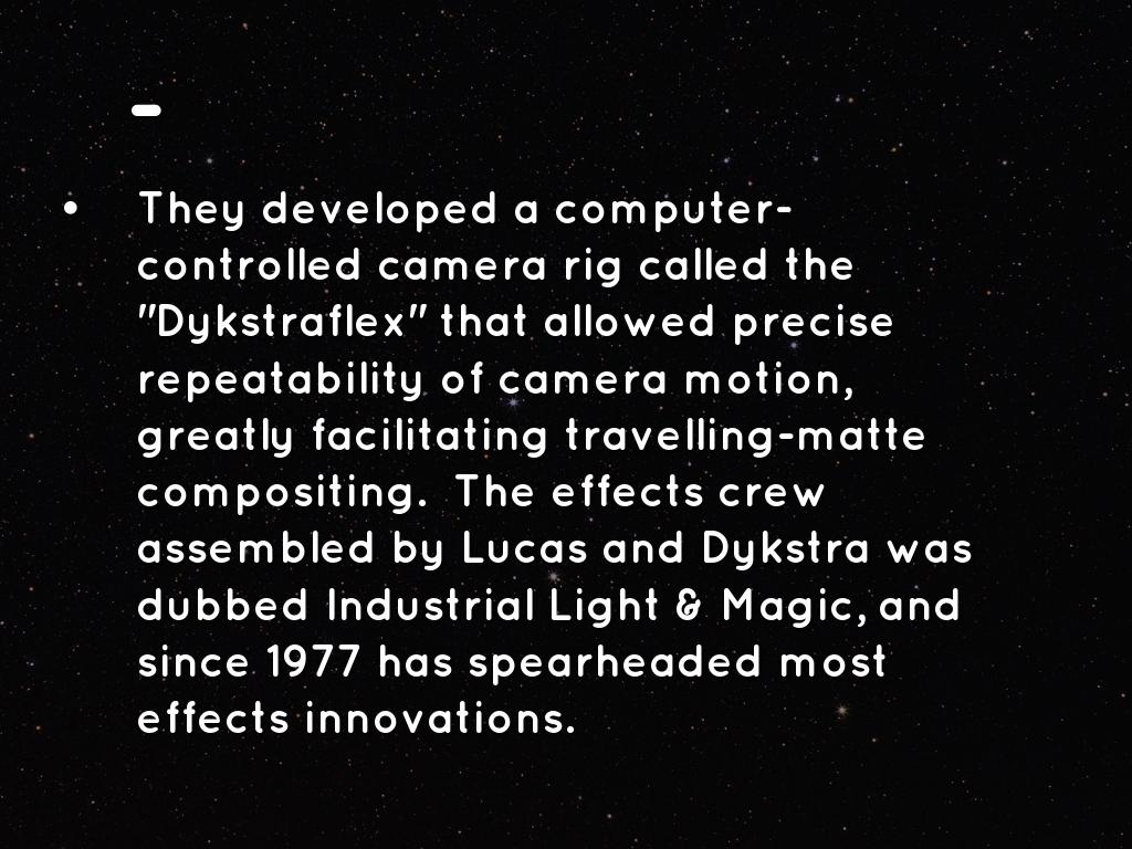 They developed a computer-controlled camera rig called the "Dykstraflex" that allowed precise repeatability of camera motion, greatly facilitating travelling-matte compositing. The effects crew assembled by Lucas and Dykstra was dubbed Industrial Light & Magic, and since 1977 has spearheaded most effects innovations.