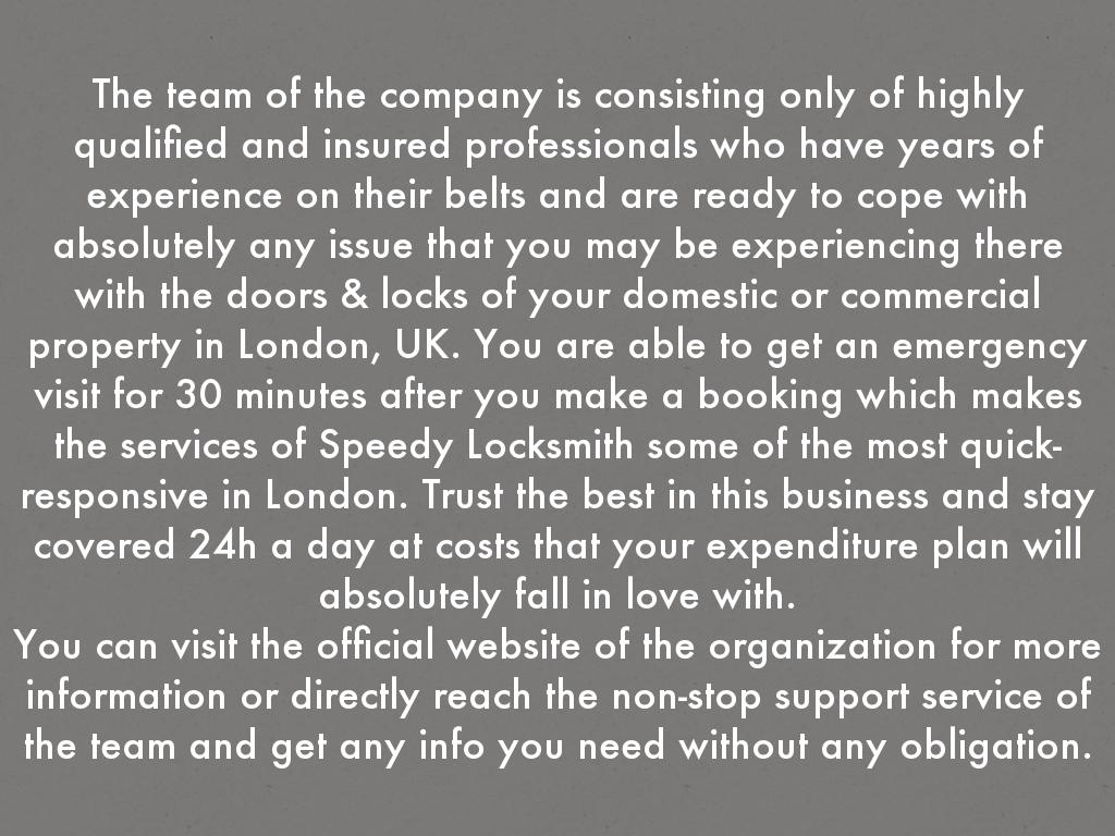 The team of the company is consisting only of highly qualified and insured professionals who have years of experience on their belts and are ready to cope with absolutely any issue that you may be experiencing there with the doors & locks of your domestic or commercial property in London, UK. You are able to get an emergency visit for 30 minutes after you make a booking which makes the services of Speedy Locksmith some of the most quick-responsive in London. Trust the best in this business and stay covered 24h a day at costs that your expenditure plan will absolutely fall in love with.