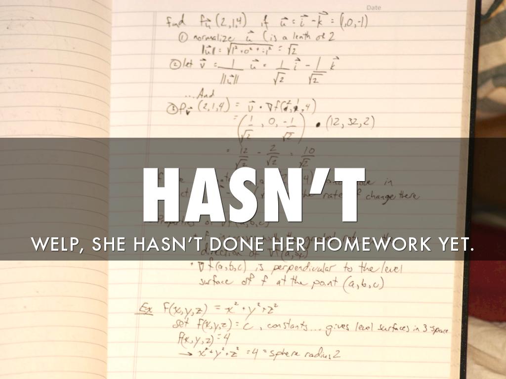 WELP, SHE HASN’T DONE HER HOMEWORK YET.