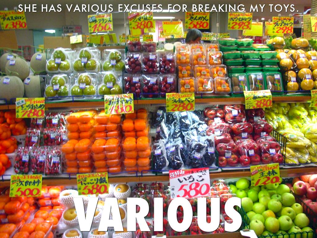 SHE HAS VARIOUS EXCUSES FOR BREAKING MY TOYS.