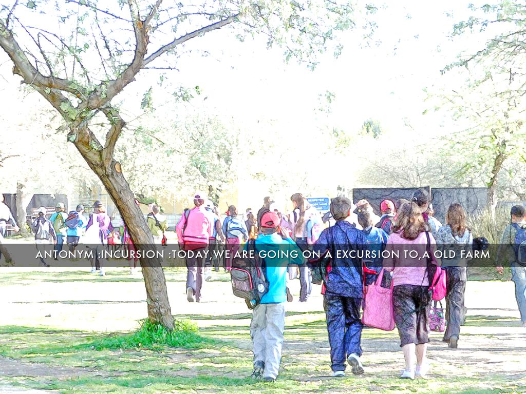 ANTONYM :INCURSION :TODAY,WE ARE GOING ON A EXCURSION TO,A OLD FARM