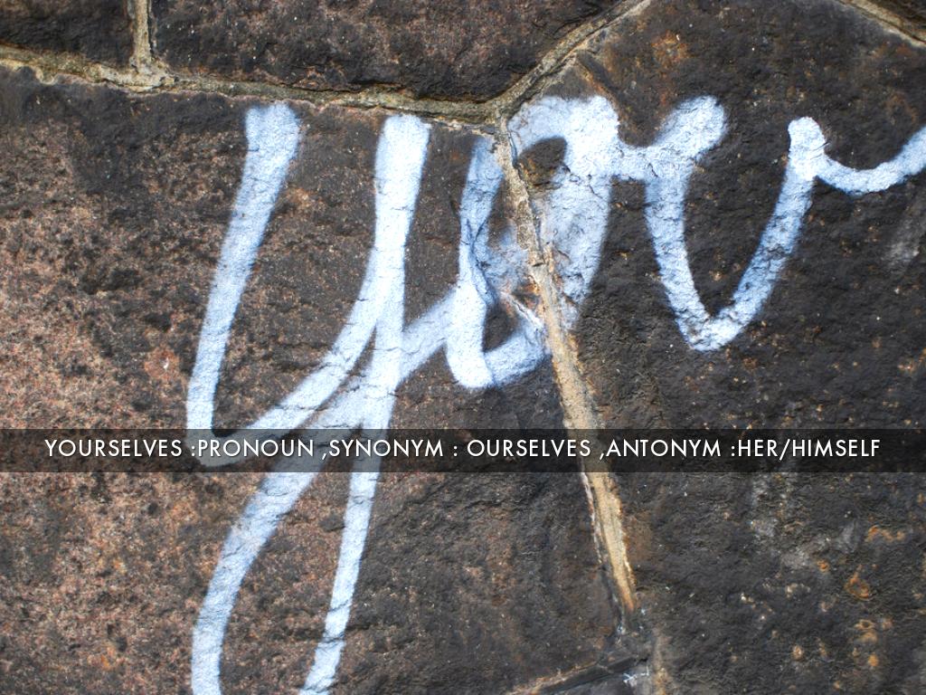 YOURSELVES :PRONOUN ,SYNONYM : OURSELVES ,ANTONYM :HER/HIMSELF