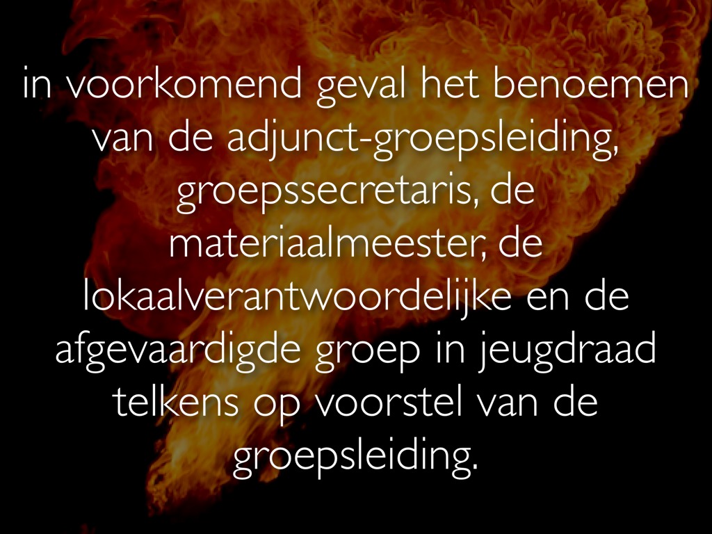 in voorkomend geval het benoemen van de adjunct-groepsleiding, groepssecretaris, de materiaalmeester, de lokaalverantwoordelijke en de afgevaardigde groep in jeugdraad telkens op voorstel van de groepsleiding.