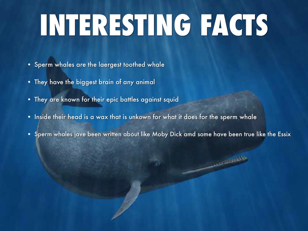• Sperm whales jave been written about like Moby Dick amd some have been true like the Essix