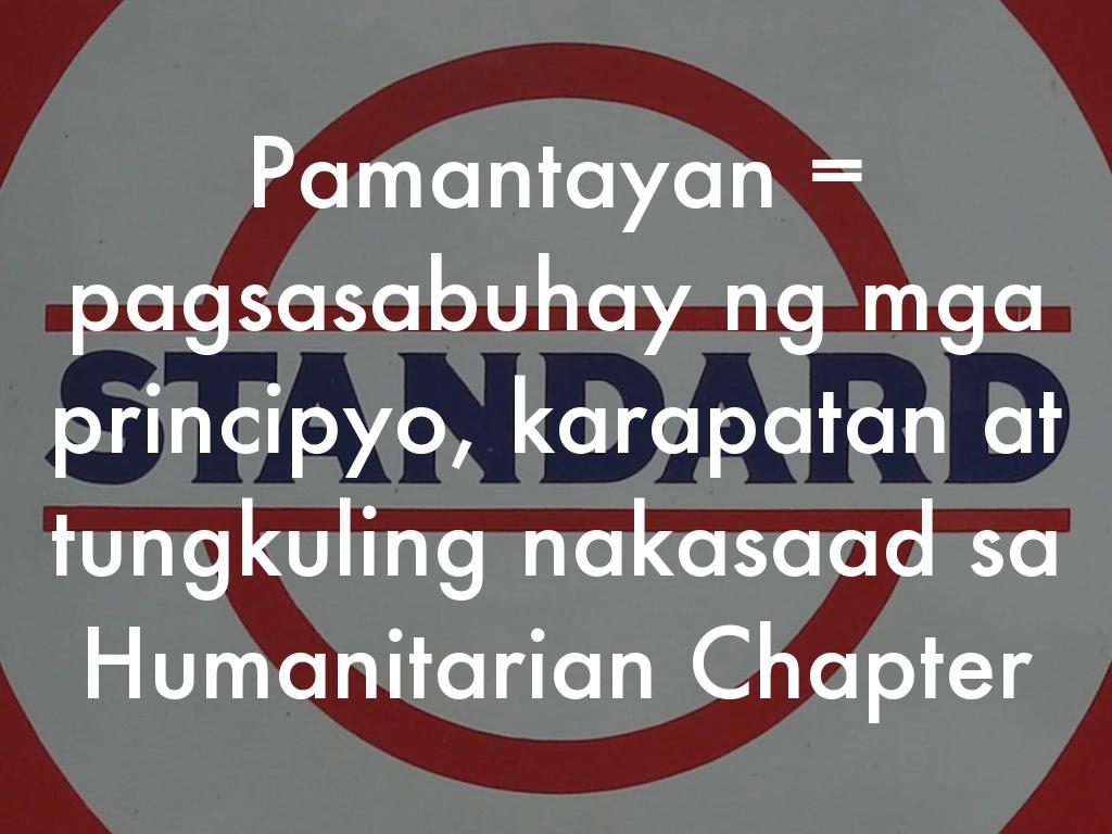 Pamantayan = pagsasabuhay ng mga principyo, karapatan at tungkuling nakasaad sa Humanitarian Chapter