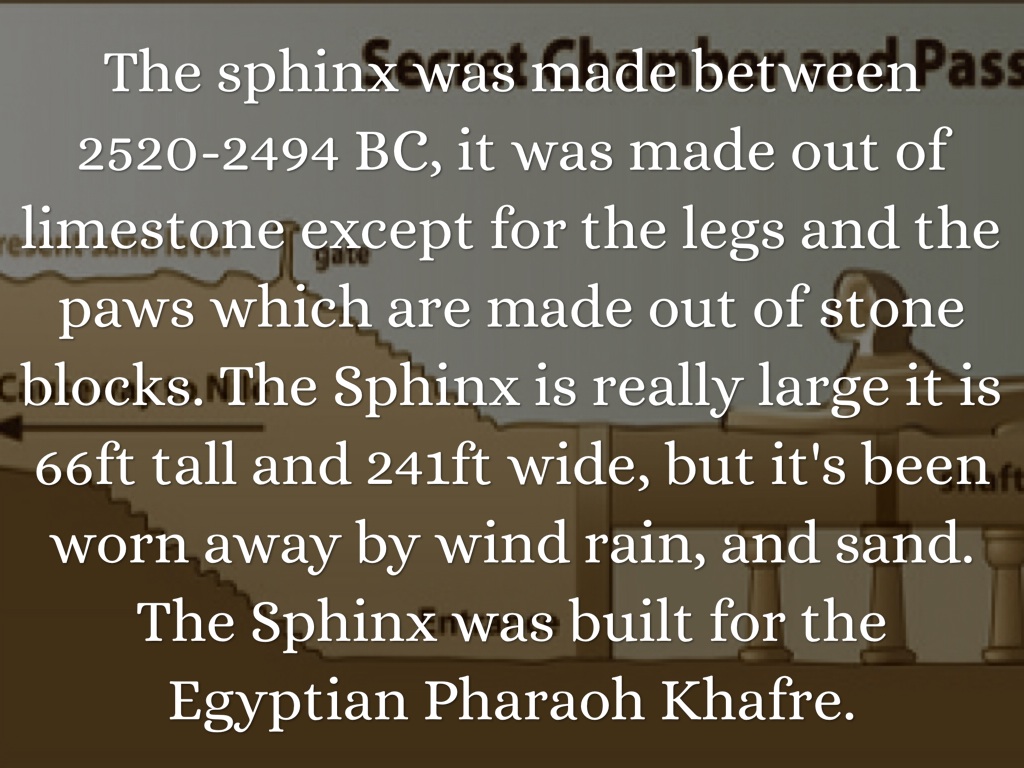 The sphinx was made between 2520-2494 BC, it was made out of limestone except for the legs and the paws which are made out of stone blocks. The Sphinx is really large it is 66ft tall and 241ft wide, but it's been worn away by wind rain, and sand. The Sphinx was built for the Egyptian Pharaoh Khafre.