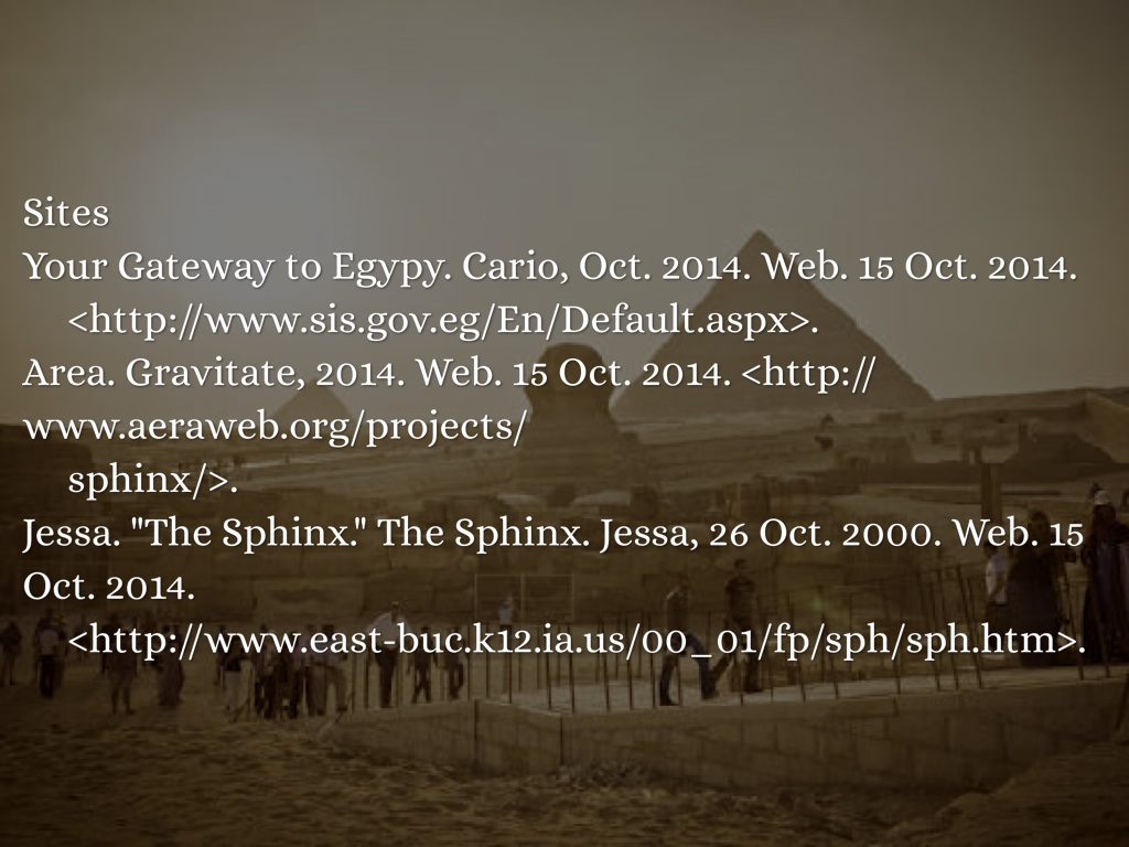 Jessa. "The Sphinx." The Sphinx. Jessa, 26 Oct. 2000. Web. 15 Oct. 2014.
