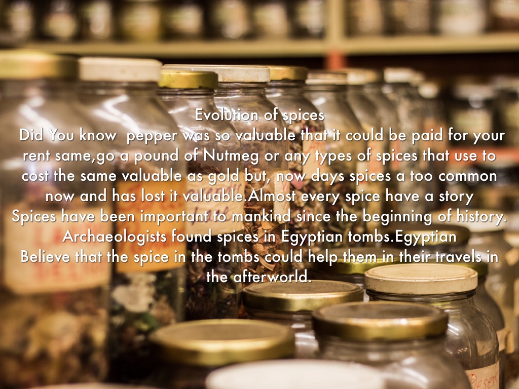 Evolution of spices Did You know pepper was so valuable that it could be paid for your rent same,go a pound of Nutmeg or any types of spices that use to cost the same valuable as gold but, now days spices a too common now and has lost it valuable.Almost every spice have a story Spices have been important to mankind since the beginning of history. Archaeologists found spices in Egyptian tombs.Egyptian Believe that the spice in the tombs could help them in their travels in the afterworld.