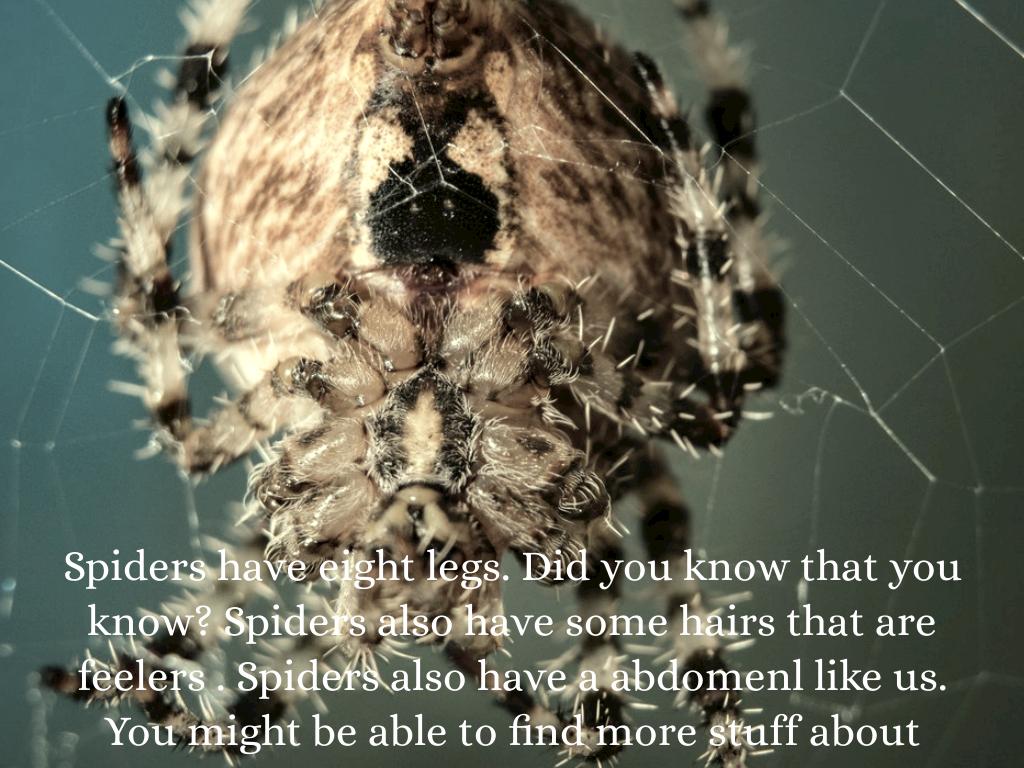 Spiders have eight legs. Did you know that you know? Spiders also have some hairs that are feelers . Spiders also have a abdomenl like us. You might be able to find more stuff about spiders then I found out