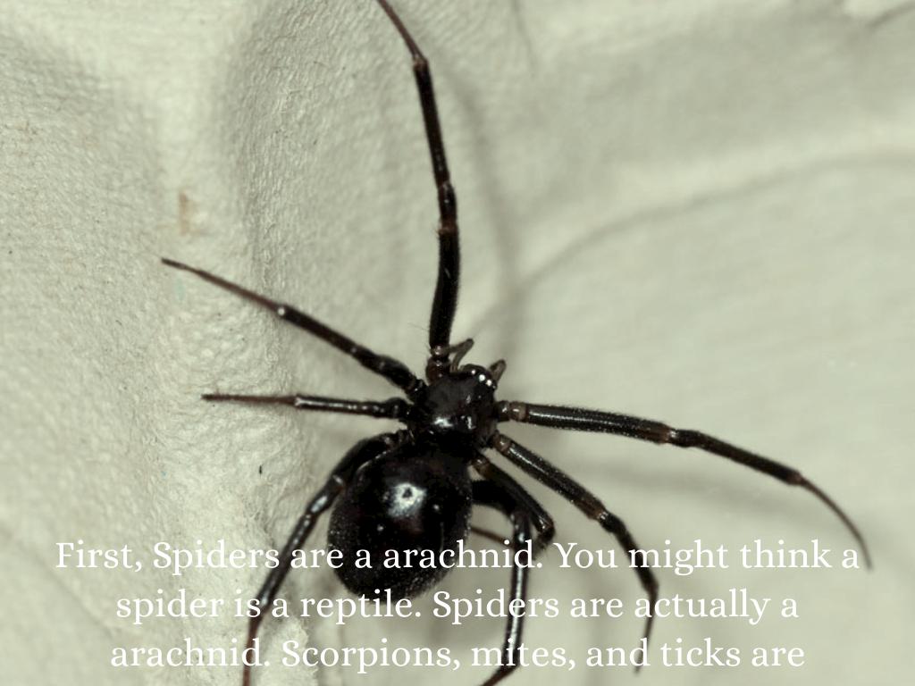 First, Spiders are a arachnid. You might think a spider is a reptile. Spiders are actually a arachnid. Scorpions, mites, and ticks are arachnids too. You might of thought mites, scorpions, and ticks are reptiles too.Mostly you would think a scorpion is a reptile.